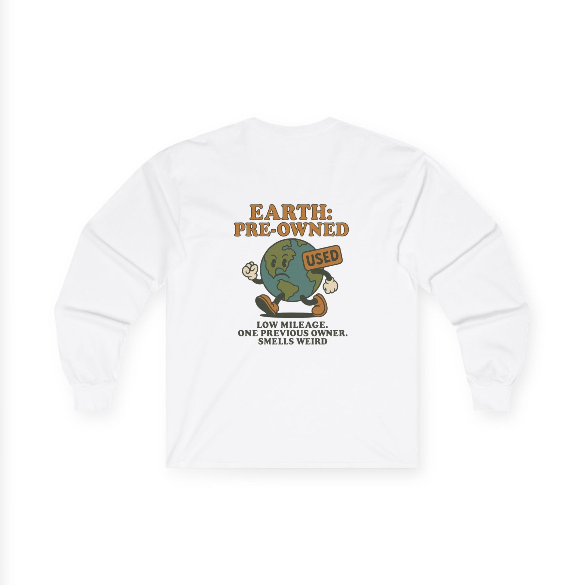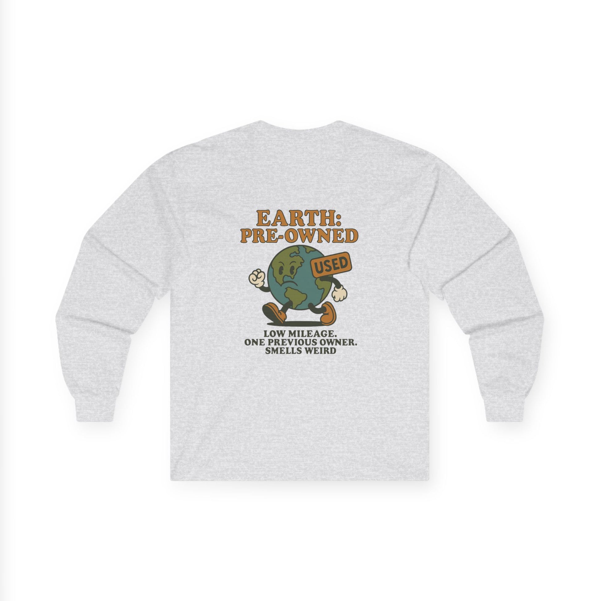 The Earth: Preowned long sleeve tee is for those who understand that this planet didn’t come fresh out of the box. It’s been scratched, dented, and passed down through generations of bad decisions — but hey, it’s still running (barely). Perfect for anyone who cares just enough to recycle their iced coffee cups but still leaves the lights on.